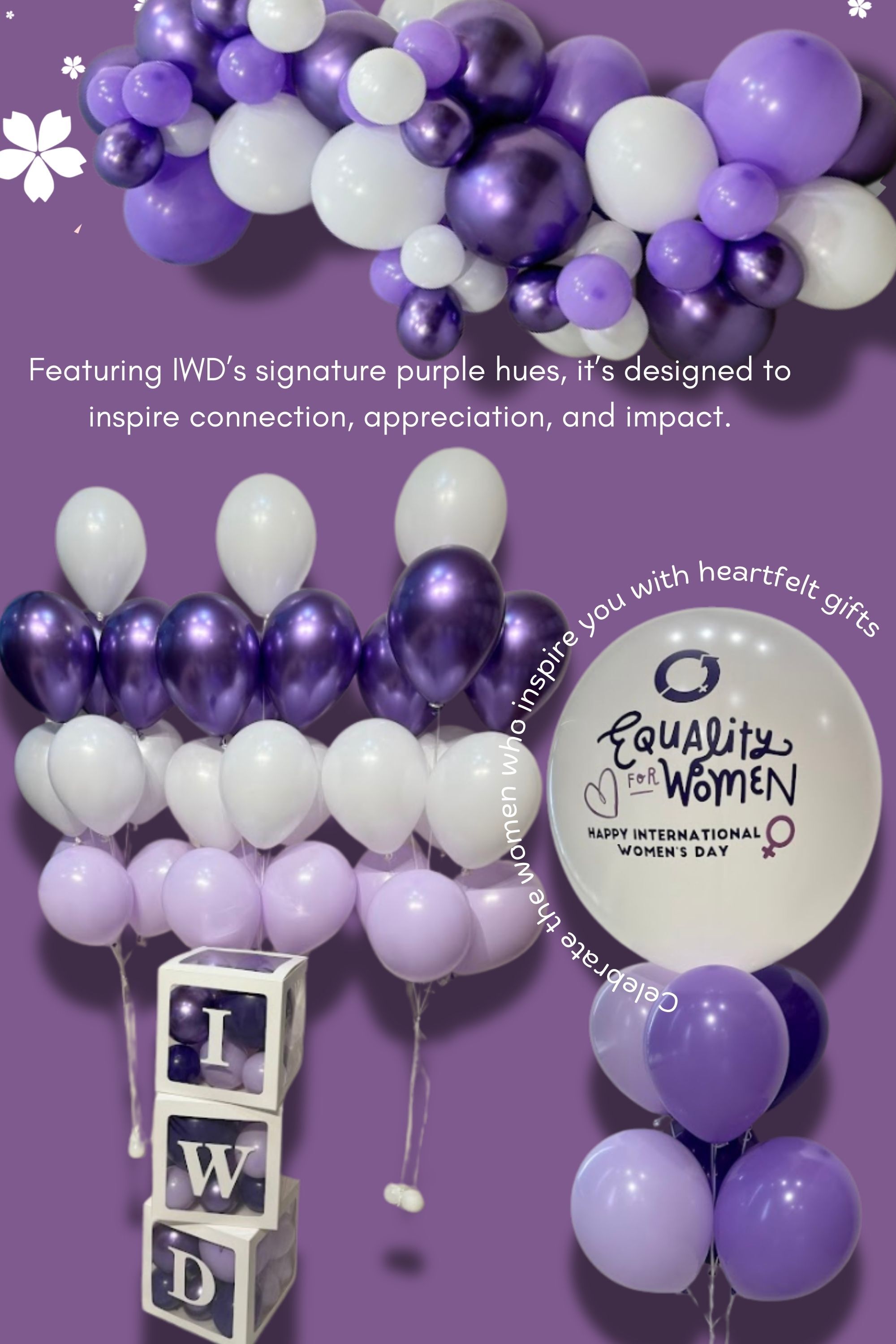 Rooted in the spirit of generosity and collaboration, our IWD 2026 balloon collection is designed in empowering shades of purple, symbolising dignity and unity. From personalised balloon bouquets and statement balloon towers to helium clusters perfect for corporate spaces and appreciation events, each piece is thoughtfully created to celebrate and uplift.
