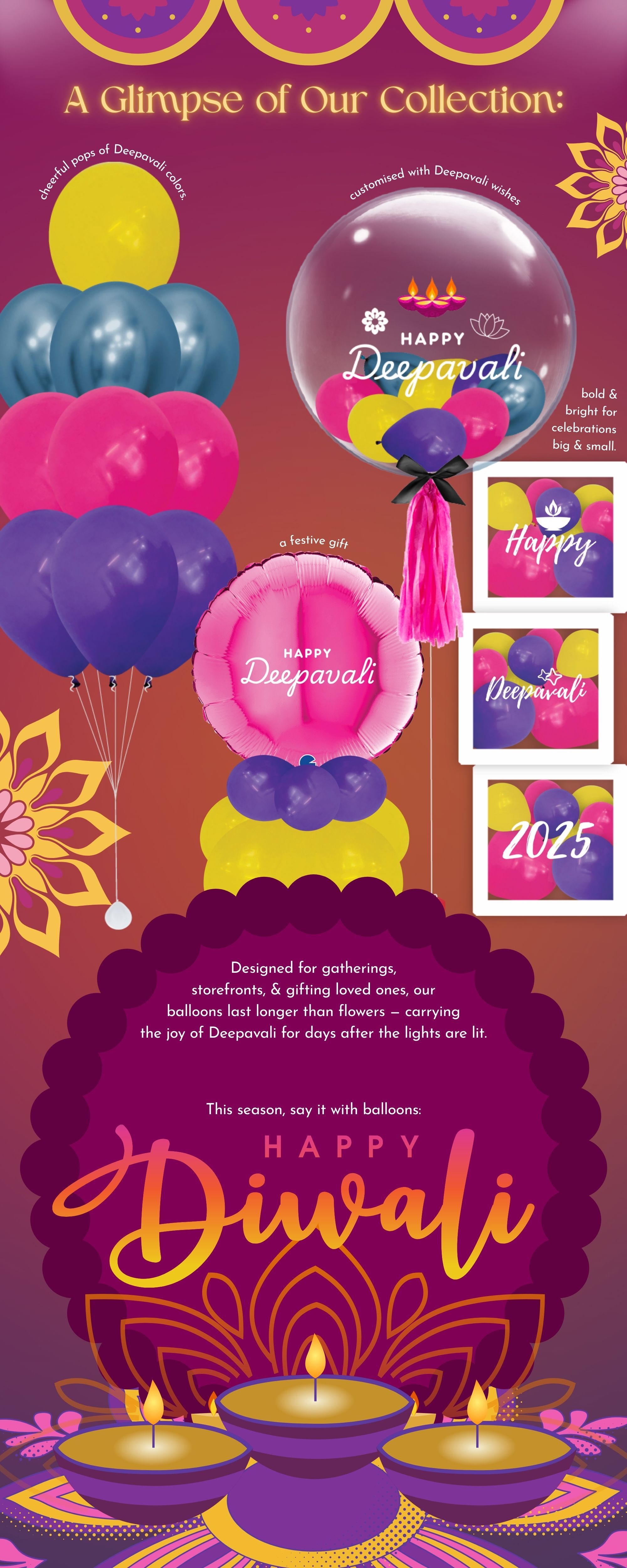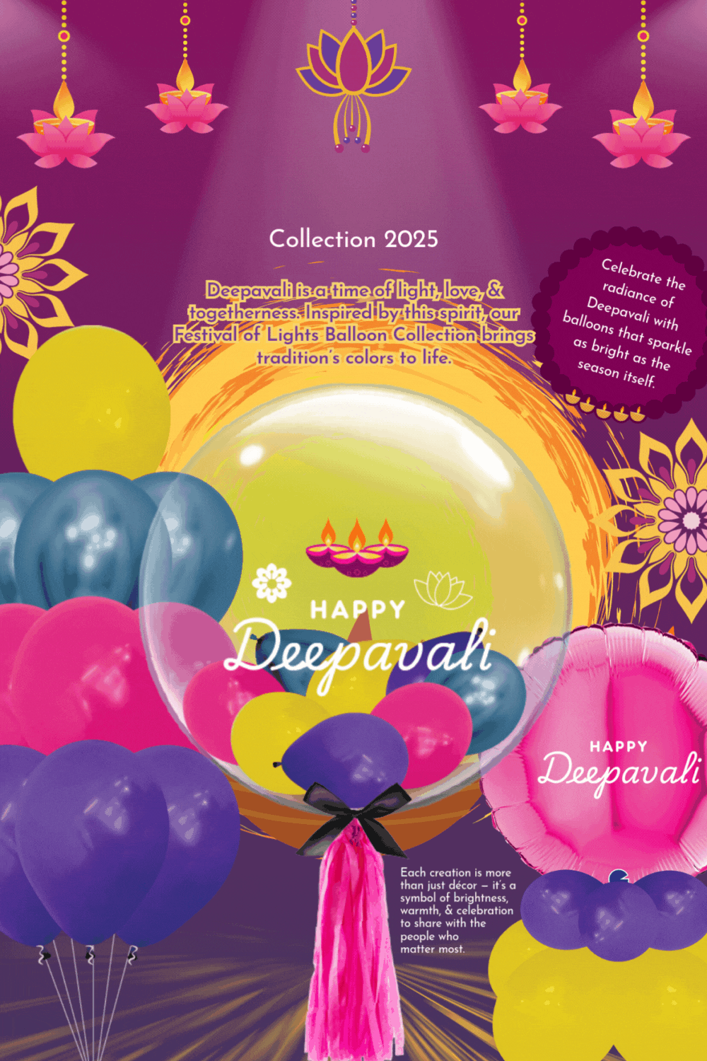Deepavali is a season of light, love, and togetherness — and this year, we’re bringing the celebration to life with our Festival of Lights Balloon Collection. Inspired by the vibrant hues of the festival — yellow, fuchsia, violet, and reflex blue — each piece is designed to shine as bright as the occasion itself.