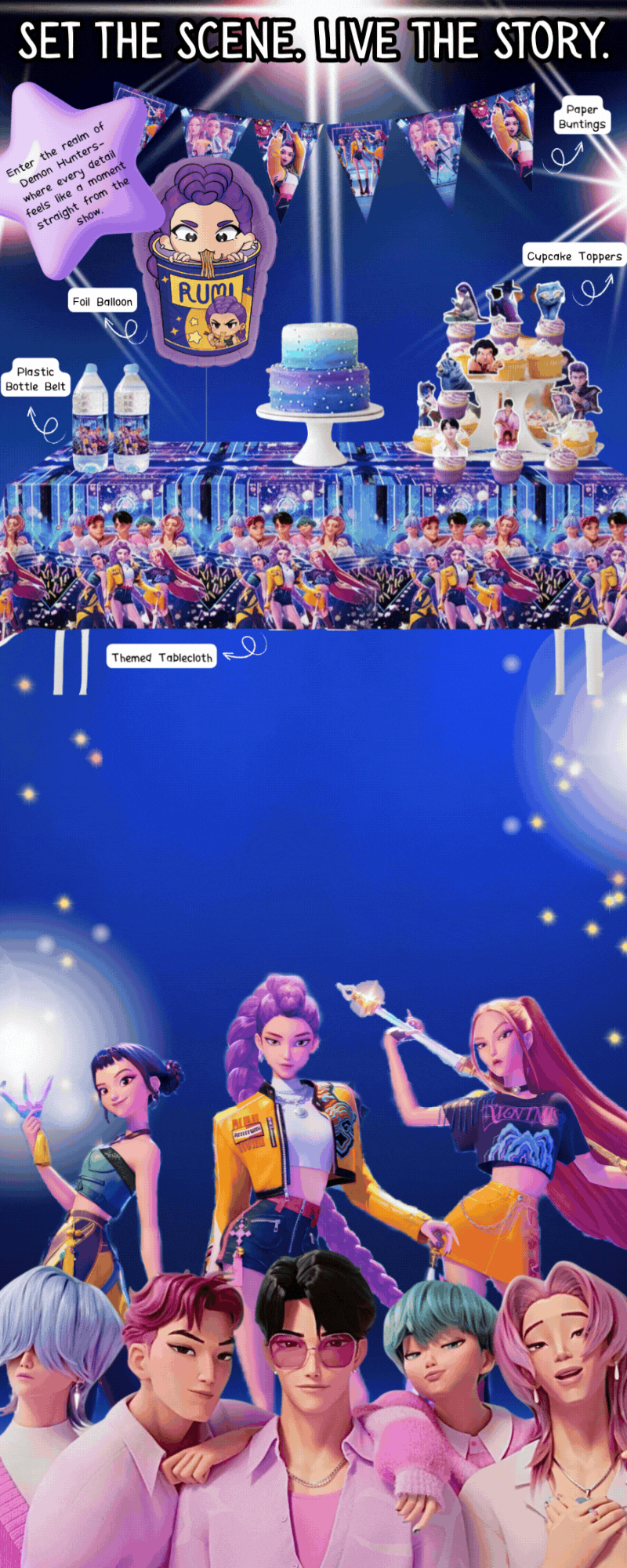 Step into a world where fantasy ignites and rhythm takes over with our K-Pop Demon Hunters Collection — your all-access pass to turning any celebration into a comeback-stage experience. Inspired by the show’s electrifying visuals and iconic lyrics, this collection brings the Demon Hunters universe straight into your party setup. From dramatic foil balloons and bubble balloons to themed table décor, cupcake toppers, and matching buntings, every detail is designed to recreate your favourite scenes with fan-level accuracy.